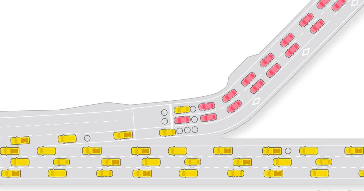 Mondjesmaat zie ik artikelen online verschijnen met kleine simulaties erin. Complexe situaties kunnen binnen 5 seconden begrijpelijk worden gemaakt. Deze over opritten voor de snelweg is niet interactief, maar alsnog de moeite waard.